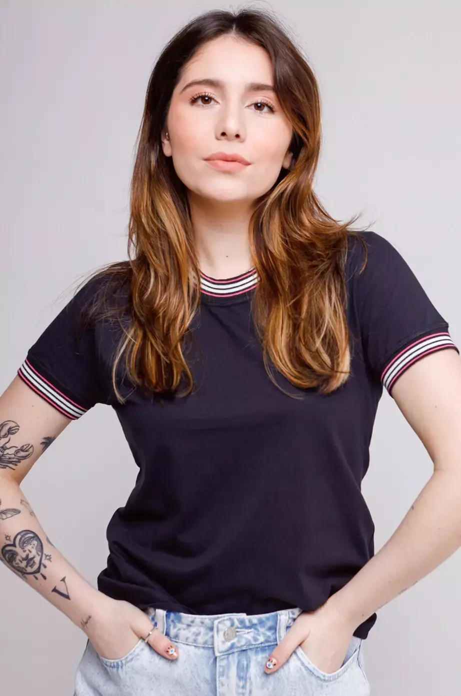 Camiseta feminina ringer tee com modelagem ajustada.